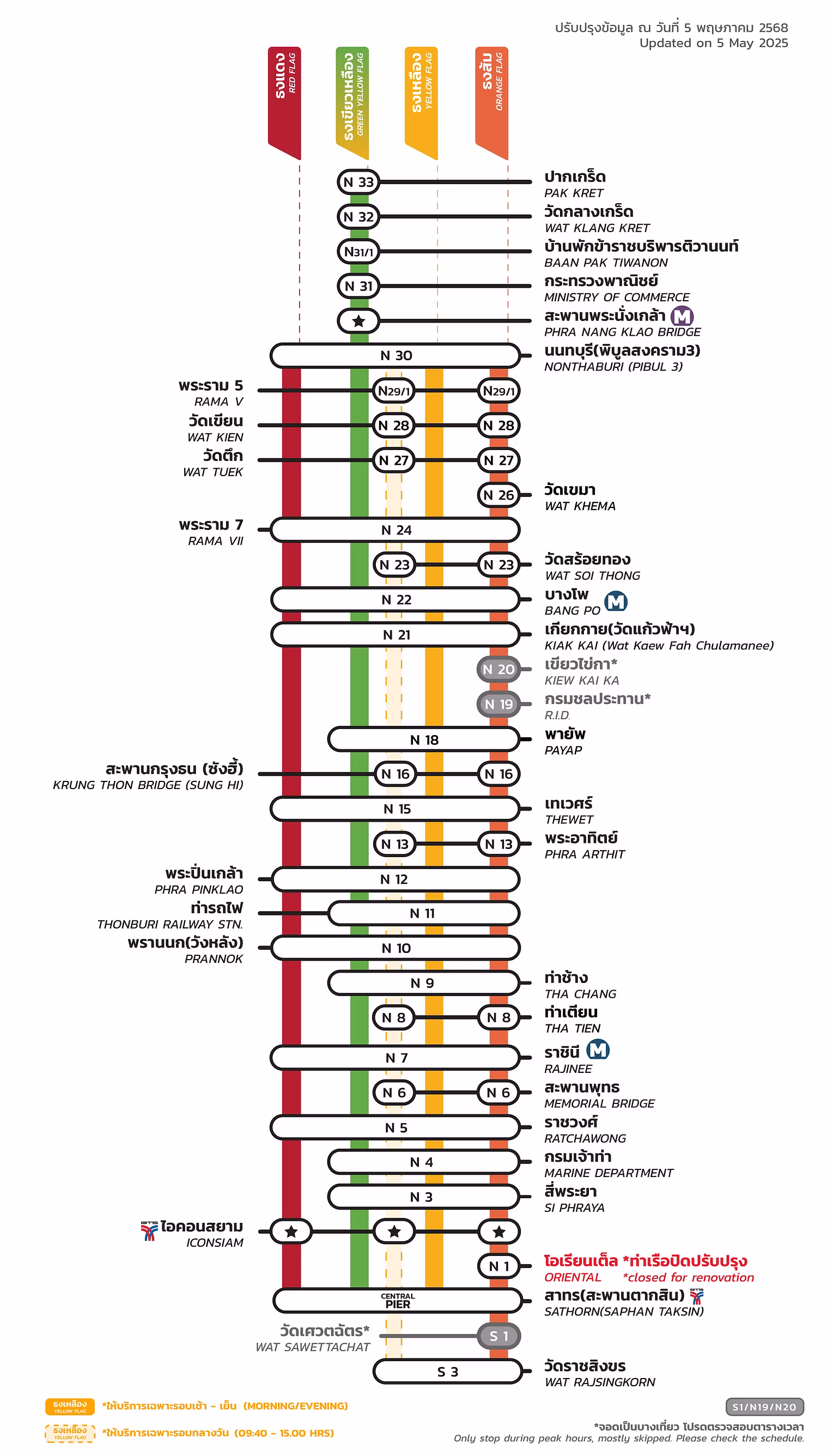 チャオプラヤー・エクスプレスボートは「旗の色」でルートやサービス内容がわかります